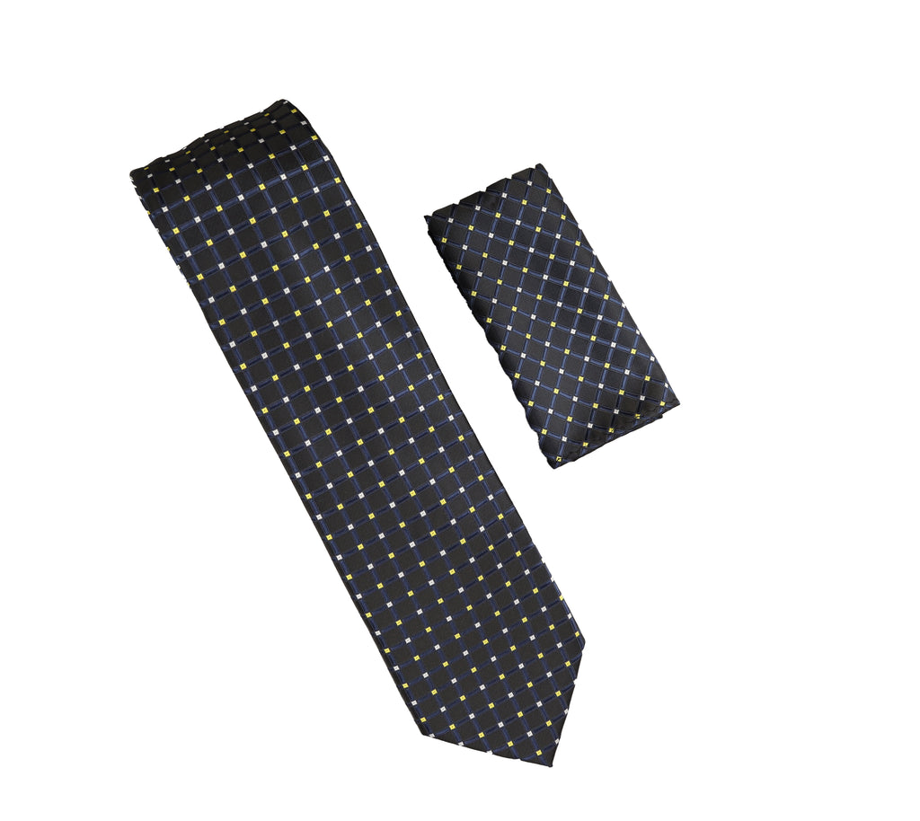 Black With Navy, Gold and Silver Mini Squares Designed Tie with Matching Pocket Square WTHXL-848