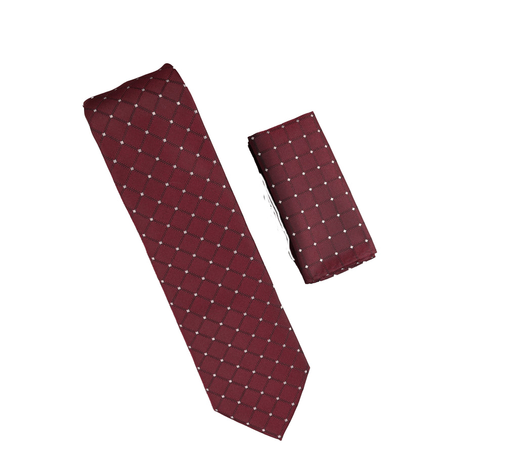 Burgundy with Large Burgundy Squares & Silver Mini Dots Extra Long Silk Tie with Matching Pocket Square WTHXL-985