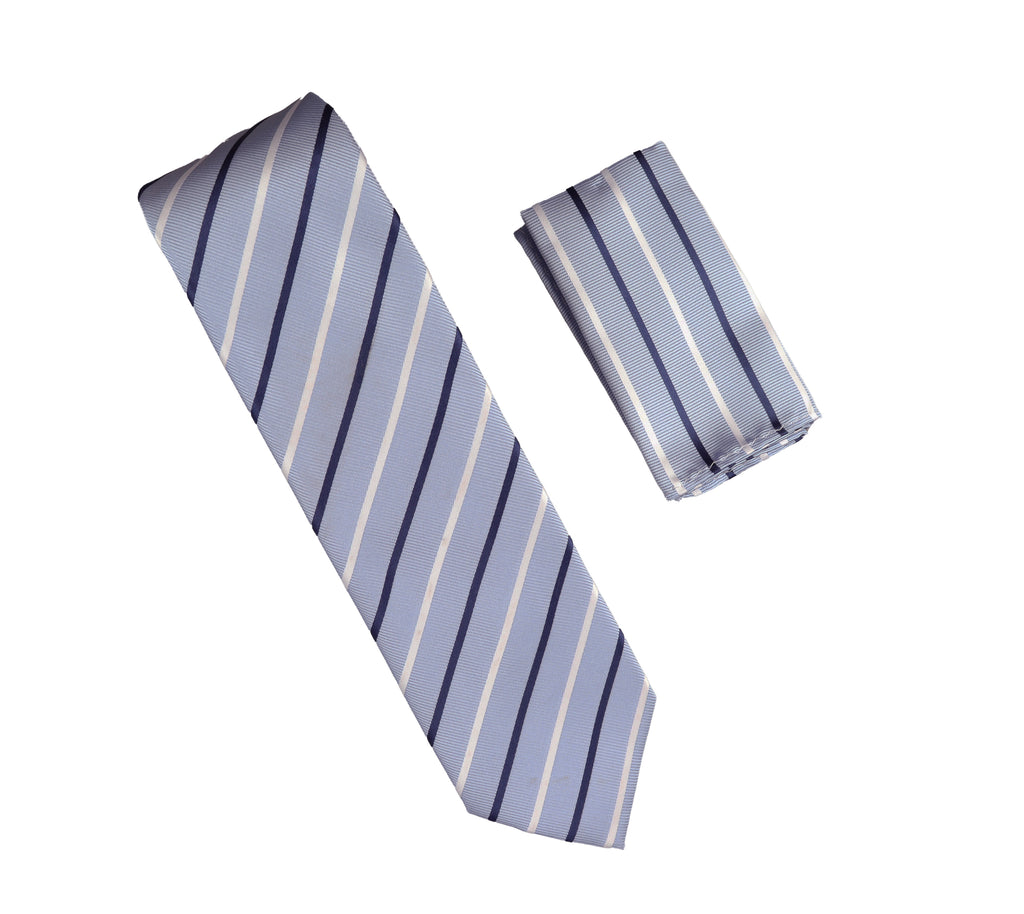 Carolina Blue, Navy and Silver Striped Necktie with Matching Pocket Square WTH-A380