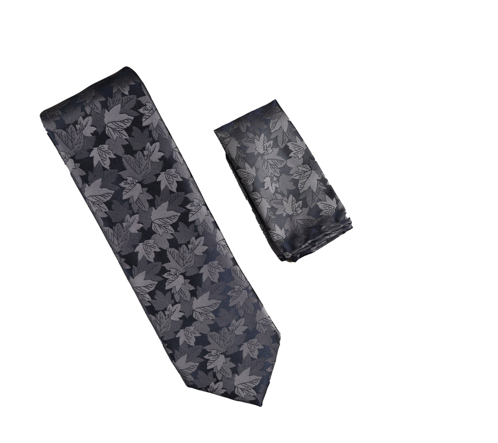 Navy, Silver & Grey Leaf Designed Extra Long Necktie Tie with Matching Pocket Square WTHXL-951