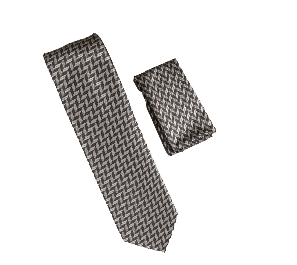 Navy & Taupe Designed Extra Long Necktie Tie with Matching Pocket Square WTHXL-961