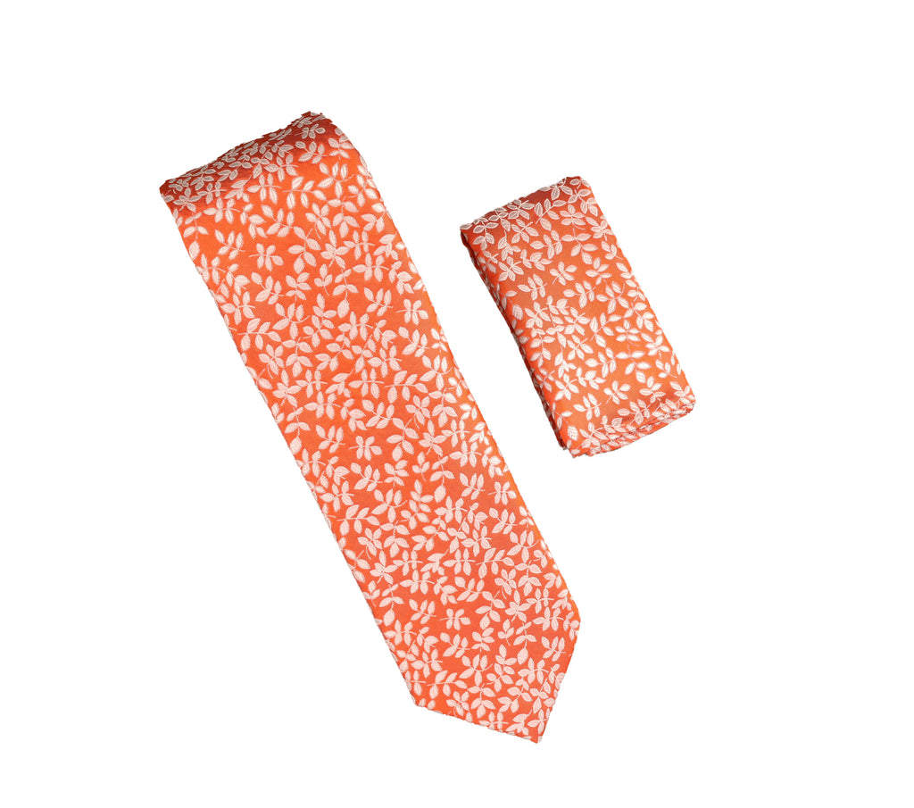Orange with Silver Silver Petals Designed Extra Long Necktie Tie with Matching Pocket Square WTHXL-947