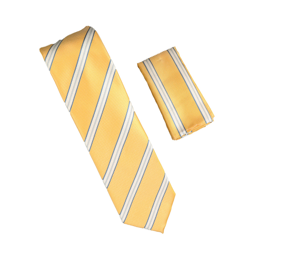 Yellow With Blue, Silver and White Striped Extra Long Necktie With Matching Pocket Square WTHXL-910