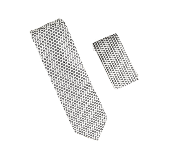 Silver with Black Flower Designed Extra Long Necktie Tie with Matching Pocket Square WTHXL-944
