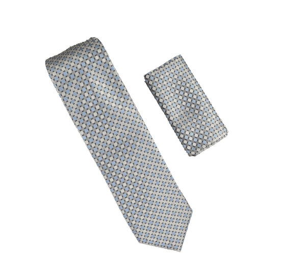 Silver, Baby Blue & Light Blue Floral Designed Necktie Tie with Matching Pocket Square LTD-958