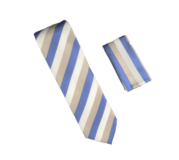 Baby Blue, Silver & White Striped Extra Long Necktie With Matching Pocket Square WTHXL-900