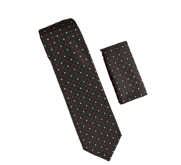 Black, With Mini Red and Silver Squares Designed Tie with Matching Pocket Square WTHXL-846