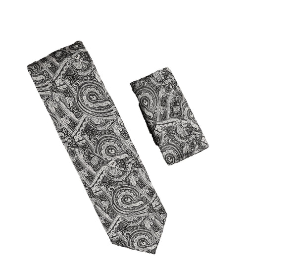 Black, Silver & Grey Designed Silk Tie with Matching Pocket Square WTHXL-871