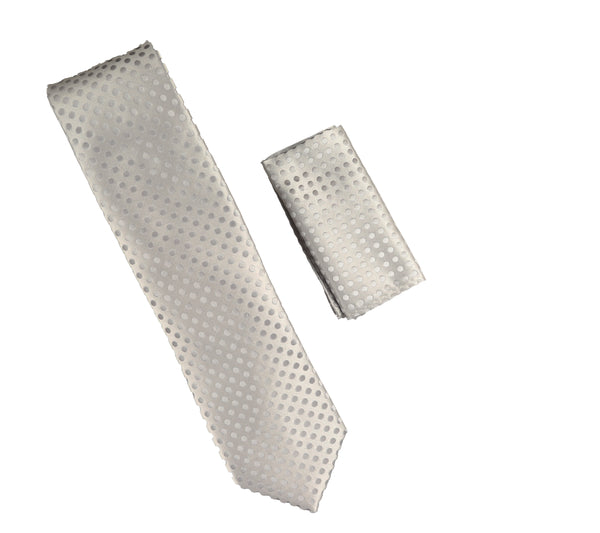 Metallic Silver With Silver Dotted Designed Silk Tie with Matching Pocket Square WTHXL-875