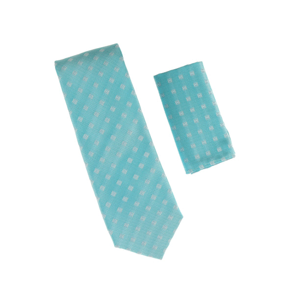 Turquoise With Silver Square Designed Extra Long Silk Tie With Matching Square WTHXL-576