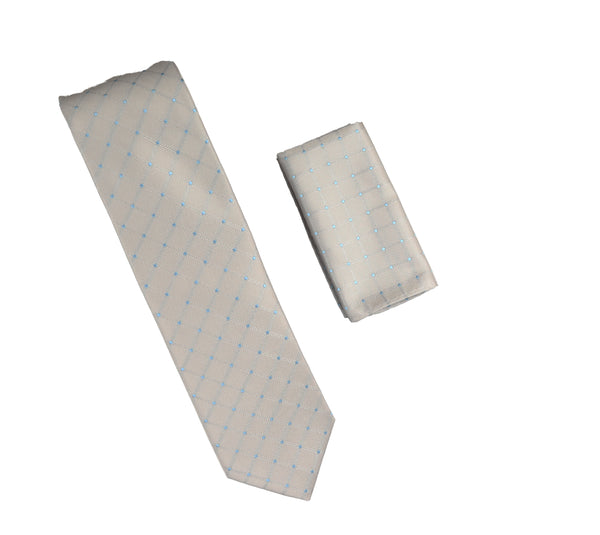 Silver with Large Silver Squares & Baby Blue Mini Dotted Extra Long Silk with Matching Pocket Square WTHXL-983