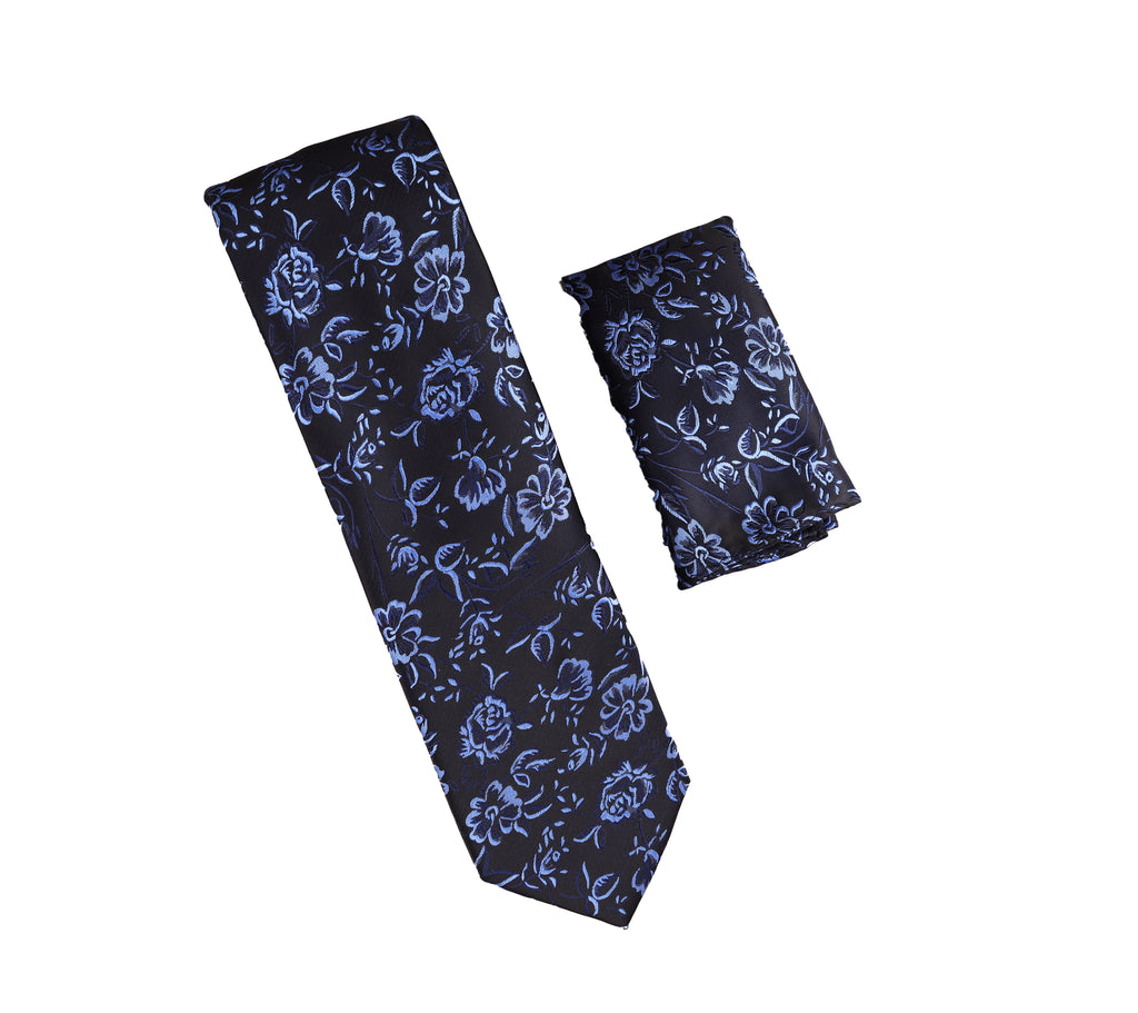 Black with Navy and Light Blue Flower Designed Necktie with Matching Pocket Square WTH-A329