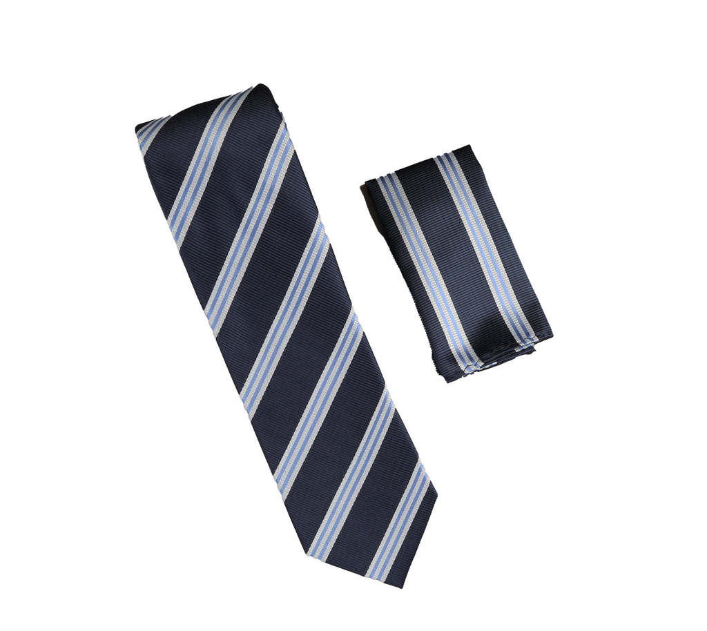 Navy, Silver and Light Blue Stripes Designed Necktie with Matching Pocket Square WTH-A335