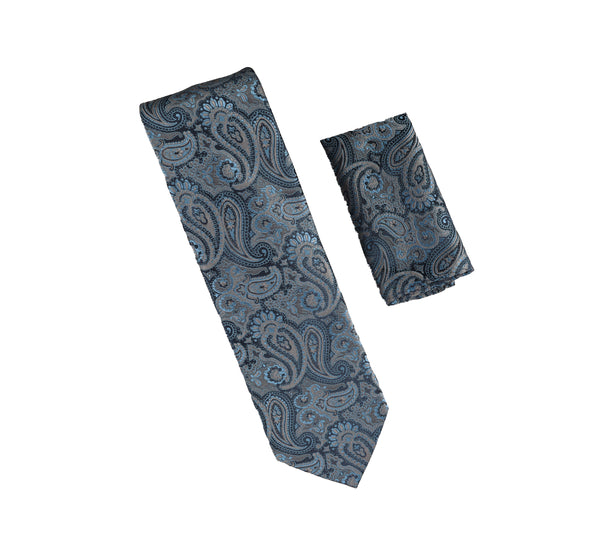 Steel Blue, Black and Grey Paisley Designed Necktie with Matching Pocket Square WTH-A340
