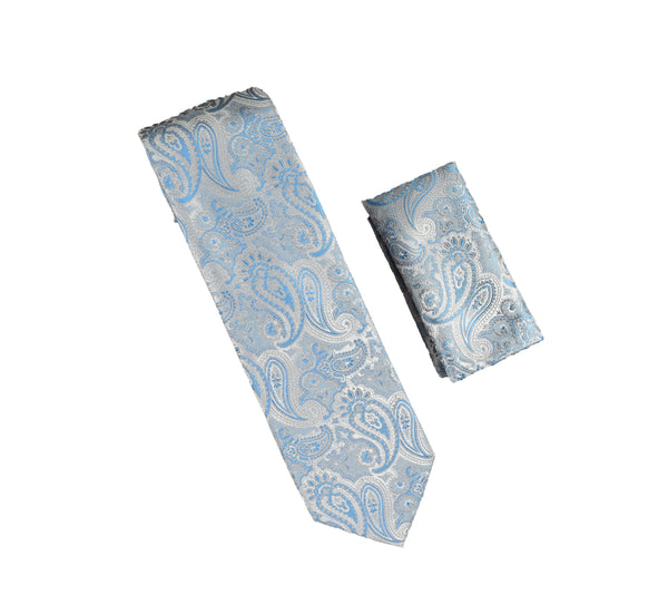 Silver, Light Blue and Grey Paisley Designed Necktie with Matching Pocket Square WTH-A342