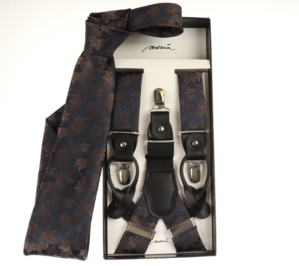 *Inventory Sale - Navy, Champagne Toast & Tan Leaf Designed Necktie & Suspender Set with Matching Pocket Square SPTST-952