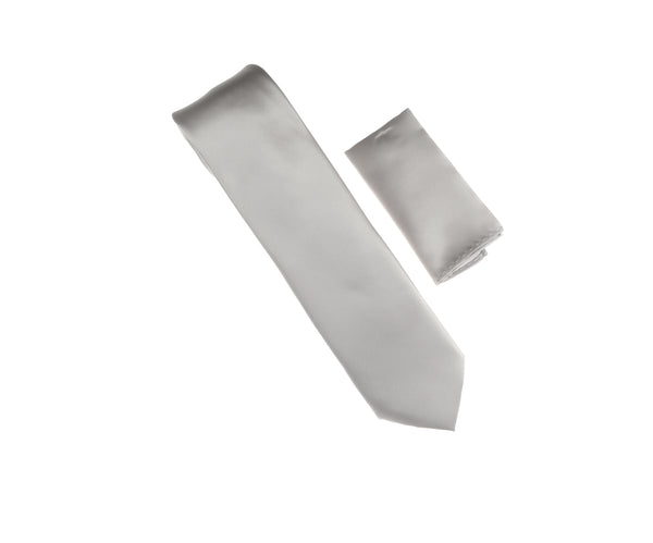 Silver Satin Finish Silk Extra Long Necktie with Matching Pocket Square SWTHXL-261