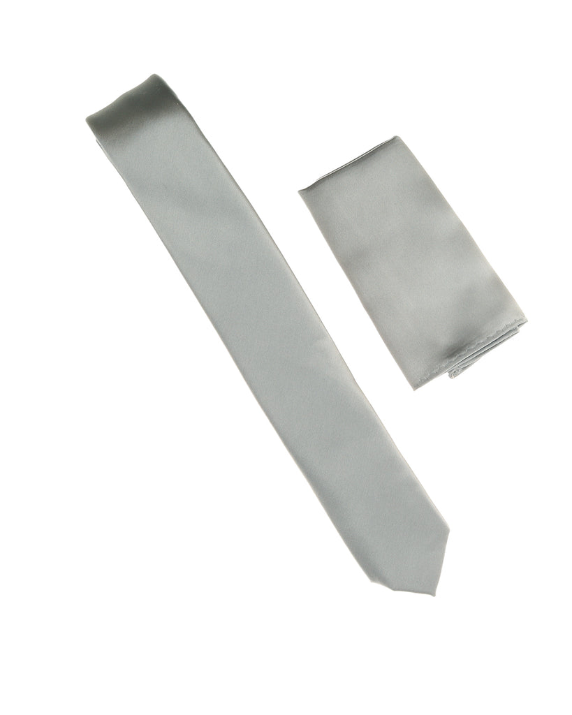 Mystic Silver Satin Finish Silk Skinny Necktie with Matching Pocket Square 2" Width SSKT-251